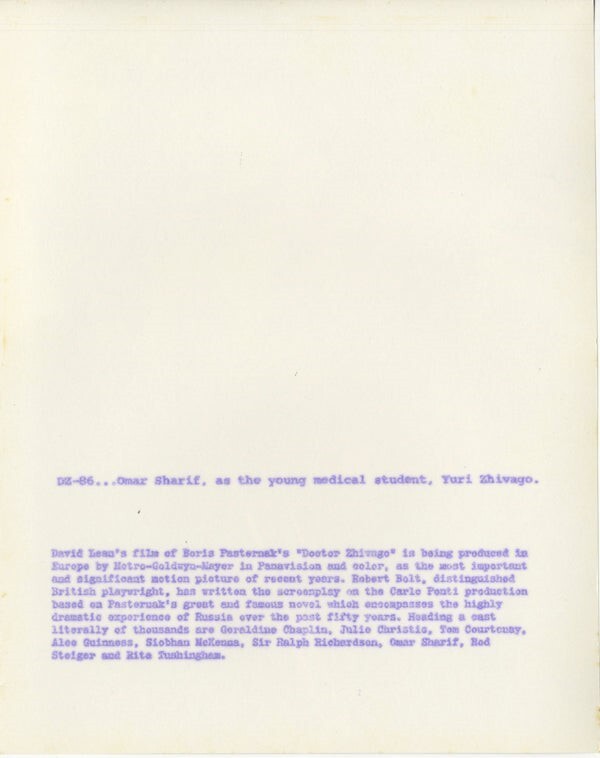 Doctor Zhivago 1965 Omar Sharif medical student scene Original 8x10 Photo with Snipe Near Mint Condition This item is an ORIGINAL 8x10 photo from the historic archives of Silver Screen Mementos. This original photograph was made in the actual year the film, television show or event was produced. The movie studios produced publicity photographs for distribution to the press, photo agencies and publicity departments to advertise the film/tv show or event. Very often original photos have press release information on the reverse of the photo - movie credits, description of the scene, event and people involved. This is a historic piece of cinema art and is being offered from one collector to another, no rights given or implied. Silver Screen are gradually releasing thousands of Original Photographs, Transparencies, Negatives, Lobby Cards, Posters, Magazines and other memorabilia from our historic archive.