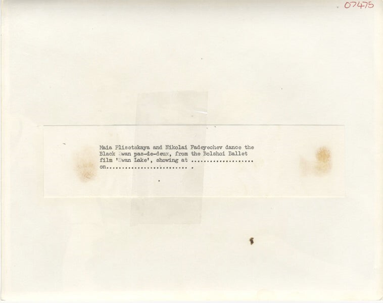 Swan Lake 1957 Maia Plisetskaya, Nikolai Fadeyechev Bolshoi Ballet Pas de deux Black Swan Original 8x10 Photo with Snipe VG/Near Mint Condition This item is an ORIGINAL 8x10 photo from the historic archives of Silver Screen Mementos. This original photograph was made in the actual year the film, television show or event was produced. The movie studios produced publicity photographs for distribution to the press, photo agencies and publicity departments to advertise the film/tv show or event. Very often original photos have press release information on the reverse of the photo - movie credits, description of the scene, event and people involved. This is a historic piece of cinema art and is being offered from one collector to another, no rights given or implied. Silver Screen are gradually releasing thousands of Original Photographs, Transparencies, Negatives, Lobby Cards, Posters, Magazines and other memorabilia from our historic archive.