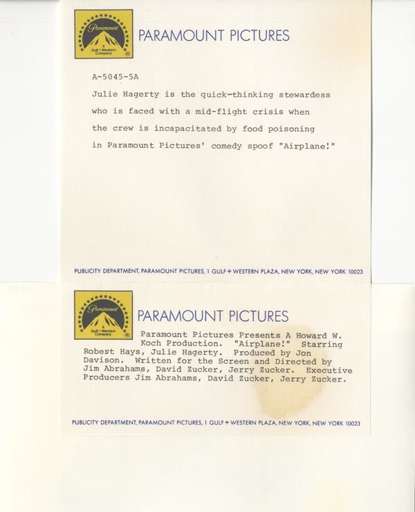 Airplane! Julie Hagerty 1980 Publicity Portrait Original 8x10 Photo with Snipe Near Mint Condition This item is an ORIGINAL 8x10 photo from the historic archives of Silver Screen Mementos. This original photograph was made in the actual year the film, television show or event was produced. The movie studios produced publicity photographs for distribution to the press, photo agencies and publicity departments to advertise the film/tv show or event. Very often original photos have press release information on the reverse of the photo - movie credits, description of the scene, event and people involved. This is a historic piece of cinema art and is being offered from one collector to another, no rights given or implied. Silver Screen are gradually releasing thousands of Original Photographs, Transparencies, Negatives, Lobby Cards, Posters, Magazines and other memorabilia from our historic archive.
