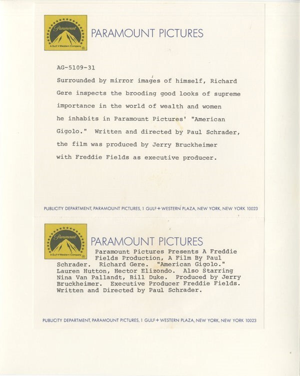 Richard Gere American Gigolo 1980 Sexy Barechested Original 8x10 Photo with Snipe Near Mint Condition This item is an ORIGINAL 8x10 photo from the historic archives of Silver Screen Mementos. This original photograph was made in the actual year the film, television show or event was produced. The movie studios produced publicity photographs for distribution to the press, photo agencies and publicity departments to advertise the film/tv show or event. Very often original photos have press release information on the reverse of the photo - movie credits, description of the scene, event and people involved. This is a historic piece of cinema art and is being offered from one collector to another, no rights given or implied. Silver Screen are gradually releasing thousands of Original Photographs, Transparencies, Negatives, Lobby Cards, Posters, Magazines and other memorabilia from our historic archive.