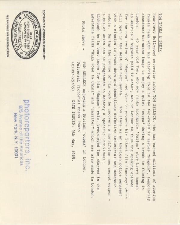 Tom Selleck Magnum PI on set between scenes in London Original 8x10 Photo Stamped with Snipe 1985 Near Mint Condition This item is an ORIGINAL 8x10 photo from the historic archives of Silver Screen Mementos. This original photograph was made in the actual year the film, television show or event was produced. The movie studios produced publicity photographs for distribution to the press, photo agencies and publicity departments to advertise the film/tv show or event. Very often original photos have press release information on the reverse of the photo - movie credits, description of the scene, event and people involved. This is a historic piece of cinema art and is being offered from one collector to another, no rights given or implied. Silver Screen are gradually releasing thousands of Original Photographs, Transparencies, Negatives, Lobby Cards, Posters, Magazines and other memorabilia from our historic archive.