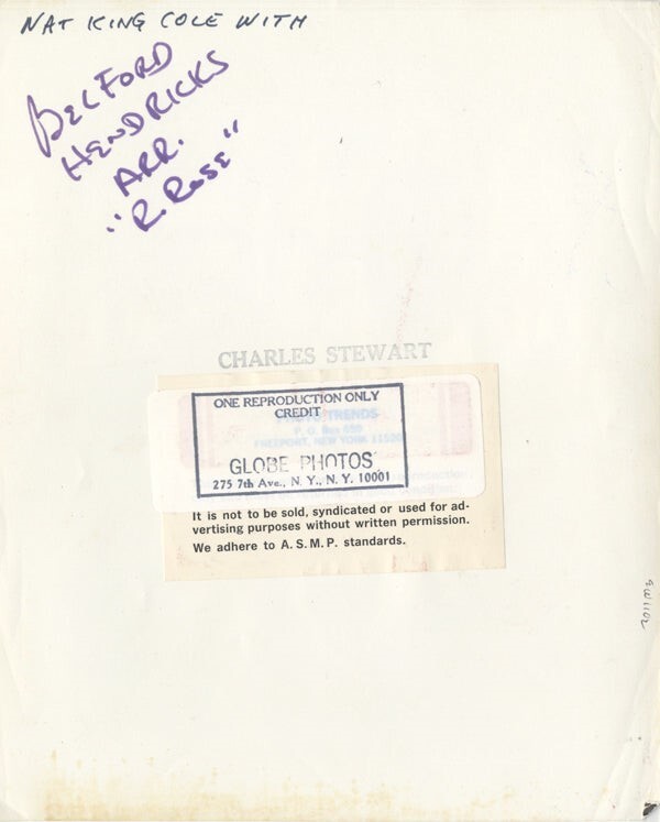 Nat King Cole & Belford Hendricks Stamped Vintage Original Type 1 8x10 Photo - very rare in VG Condition (some edge wear) This is an Original vintage photograph from the year of the concert, photo shoot or event measuring approximately 8x10 inches (20x25 cm) unless otherwise stated. Many Original vintage photographs carry the agency or photographer stamp on the back. This is a rare collectors item being offered from one collector to another, no nights given or implied. Silver Screen are gradually releasing thousands of Original Photographs, Transparencies, Negatives, Lobby Cards, Posters, Magazines and other memorabilia from our historic archive.