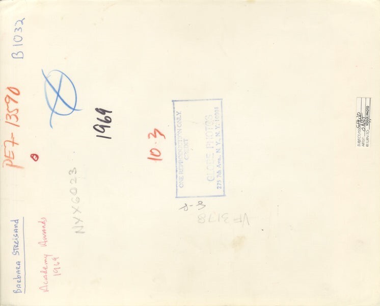 Barbra Streisand 1969 Academy Awards holding Oscar for best actress in Funny Girl Original 8x10 Photo Stamped VG Condition This item is an ORIGINAL 8x10 photo from the historic archives of Silver Screen Mementos. This original photograph was made in the actual year the film, television show or event was produced. The movie studios produced publicity photographs for distribution to the press, photo agencies and publicity departments to advertise the film/tv show or event. Very often original photos have press release information on the reverse of the photo - movie credits, description of the scene, event and people involved. This is a historic piece of cinema art and is being offered from one collector to another, no rights given or implied. Silver Screen are gradually releasing thousands of Original Photographs, Transparencies, Negatives, Lobby Cards, Posters, Magazines and other memorabilia from our historic archive.