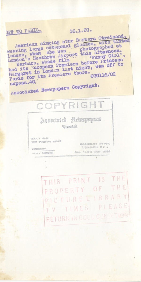 Barbra Streisand Rare Candid 1969 Heathrow Airport Glamour Original 5x10 Photo Stamped with Snipe , very rare VG/Near Mint Condition This item is an ORIGINAL 8x10 photo from the historic archives of Silver Screen Mementos. This original photograph was made in the actual year the film, television show or event was produced. The movie studios produced publicity photographs for distribution to the press, photo agencies and publicity departments to advertise the film/tv show or event. Very often original photos have press release information on the reverse of the photo - movie credits, description of the scene, event and people involved. This is a historic piece of cinema art and is being offered from one collector to another, no rights given or implied. Silver Screen are gradually releasing thousands of Original Photographs, Transparencies, Negatives, Lobby Cards, Posters, Magazines and other memorabilia from our historic archive.
