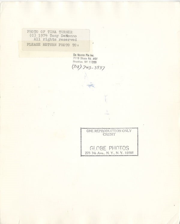 Tina Turner 1974 leggy popstar singing in concert Original 8x10 Double Weight Silver Gelatin Photo Stamped with Snipe, very rare VG/Near Mint Condition This is an Original vintage photograph from the year of the concert, photo shoot or event measuring approximately 8x10 inches (20x25 cm) unless otherwise stated. Many Original vintage photographs carry the agency or photographer stamp on the back. This is a rare collectors item being offered from one collector to another, no nights given or implied. Silver Screen are gradually releasing thousands of Original Photographs, Transparencies, Negatives, Lobby Cards, Posters, Magazines and other memorabilia from our historic archive.