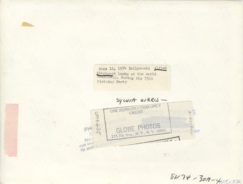 Alfred Hitchcock Director 75th Birthday Party Stamped Original 7x9 Photo Rare VG/Nera Mint This item is an ORIGINAL 8x10 photo from the historic archives of Silver Screen Mementos. This original photograph was made in the actual year the film, television show or event was produced. The movie studios produced publicity photographs for distribution to the press, photo agencies and publicity departments to advertise the film/tv show or event. Very often original photos have press release information on the reverse of the photo - movie credits, description of the scene, event and people involved. This is a historic piece of cinema art and is being offered from one collector to another, no rights given or implied. Silver Screen are gradually releasing thousands of Original Photographs, Transparencies, Negatives, Lobby Cards, Posters, Magazines and other memorabilia from our historic archive.