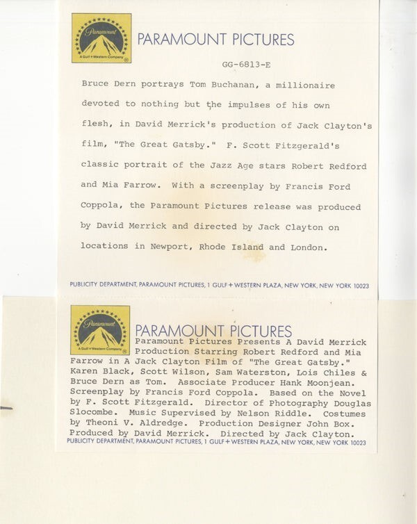 The Great Gatsby Bruce Dern Film Scene Smiling Original 8x10 Photo with Snipe 1974 Near Mint Condition This item is an ORIGINAL 8x10 photo from the historic archives of Silver Screen Mementos. This original photograph was made in the actual year the film, television show or event was produced. The movie studios produced publicity photographs for distribution to the press, photo agencies and publicity departments to advertise the film/tv show or event. Very often original photos have press release information on the reverse of the photo - movie credits, description of the scene, event and people involved. This is a historic piece of cinema art and is being offered from one collector to another, no rights given or implied. Silver Screen are gradually releasing thousands of Original Photographs, Transparencies, Negatives, Lobby Cards, Posters, Magazines and other memorabilia from our historic archive.
