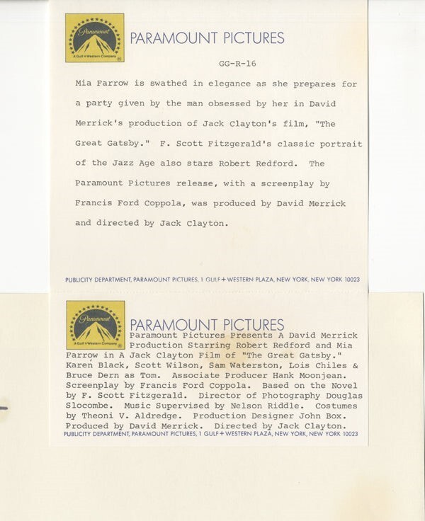 The Great Gatsby Mia Farrow 1920's Glamorous Flapper Original 8x10 Photo with Snipe 1974 Near Mint Condition This item is an ORIGINAL 8x10 photo from the historic archives of Silver Screen Mementos. This original photograph was made in the actual year the film, television show or event was produced. The movie studios produced publicity photographs for distribution to the press, photo agencies and publicity departments to advertise the film/tv show or event. Very often original photos have press release information on the reverse of the photo - movie credits, description of the scene, event and people involved. This is a historic piece of cinema art and is being offered from one collector to another, no rights given or implied. Silver Screen are gradually releasing thousands of Original Photographs, Transparencies, Negatives, Lobby Cards, Posters, Magazines and other memorabilia from our historic archive.