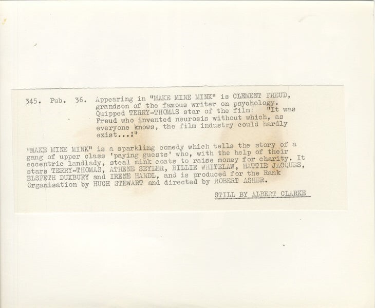 Make Mine Mink 1960 Clement Freud gambling scene Original 7x9 approx Photo with Snipe Near Mint Condition This item is an ORIGINAL 8x10 photo from the historic archives of Silver Screen Mementos. This original photograph was made in the actual year the film, television show or event was produced. The movie studios produced publicity photographs for distribution to the press, photo agencies and publicity departments to advertise the film/tv show or event. Very often original photos have press release information on the reverse of the photo - movie credits, description of the scene, event and people involved. This is a historic piece of cinema art and is being offered from one collector to another, no rights given or implied. Silver Screen are gradually releasing thousands of Original Photographs, Transparencies, Negatives, Lobby Cards, Posters, Magazines and other memorabilia from our historic archive.