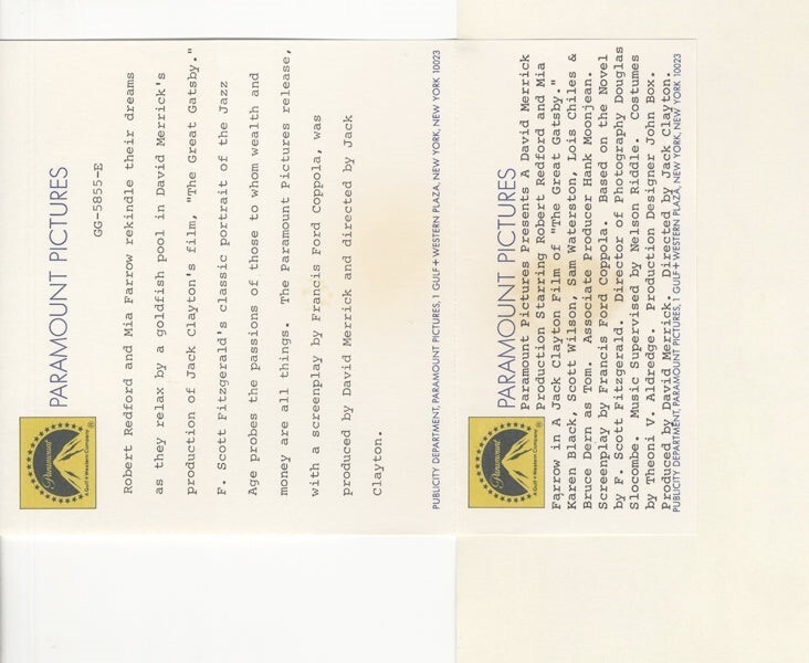 The Great Gatsby Mia Farrow,Robert Redford Original 8x10 Photo with Snipe 1974 Near Mint Condition This item is an ORIGINAL 8x10 photo from the historic archives of Silver Screen Mementos. This original photograph was made in the actual year the film, television show or event was produced. The movie studios produced publicity photographs for distribution to the press, photo agencies and publicity departments to advertise the film/tv show or event. Very often original photos have press release information on the reverse of the photo - movie credits, description of the scene, event and people involved. This is a historic piece of cinema art and is being offered from one collector to another, no rights given or implied. Silver Screen are gradually releasing thousands of Original Photographs, Transparencies, Negatives, Lobby Cards, Posters, Magazines and other memorabilia from our historic archive.