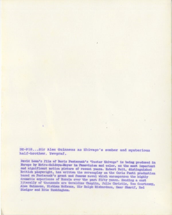 Doctor Zhivago 1965 Alec Guinness Striking Close up Original 8x10 Photo with Snipe Near Mint Condition This item is an ORIGINAL 8x10 photo from the historic archives of Silver Screen Mementos. This original photograph was made in the actual year the film, television show or event was produced. The movie studios produced publicity photographs for distribution to the press, photo agencies and publicity departments to advertise the film/tv show or event. Very often original photos have press release information on the reverse of the photo - movie credits, description of the scene, event and people involved. This is a historic piece of cinema art and is being offered from one collector to another, no rights given or implied. Silver Screen are gradually releasing thousands of Original Photographs, Transparencies, Negatives, Lobby Cards, Posters, Magazines and other memorabilia from our historic archive.