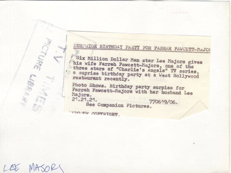 Farrah Fawcett 1970's Charlie's Angels star & husband Lee Majors Six Million Dollar Man star Birthday Party Surprise Original 6x8 Photo Stamped with Snipe VG Condition This item is an ORIGINAL 8x10 photo from the historic archives of Silver Screen Mementos. This original photograph was made in the actual year the film, television show or event was produced. The movie studios produced publicity photographs for distribution to the press, photo agencies and publicity departments to advertise the film/tv show or event. Very often original photos have press release information on the reverse of the photo - movie credits, description of the scene, event and people involved. This is a historic piece of cinema art and is being offered from one collector to another, no rights given or implied. Silver Screen are gradually releasing thousands of Original Photographs, Transparencies, Negatives, Lobby Cards, Posters, Magazines and other memorabilia from our historic archive.