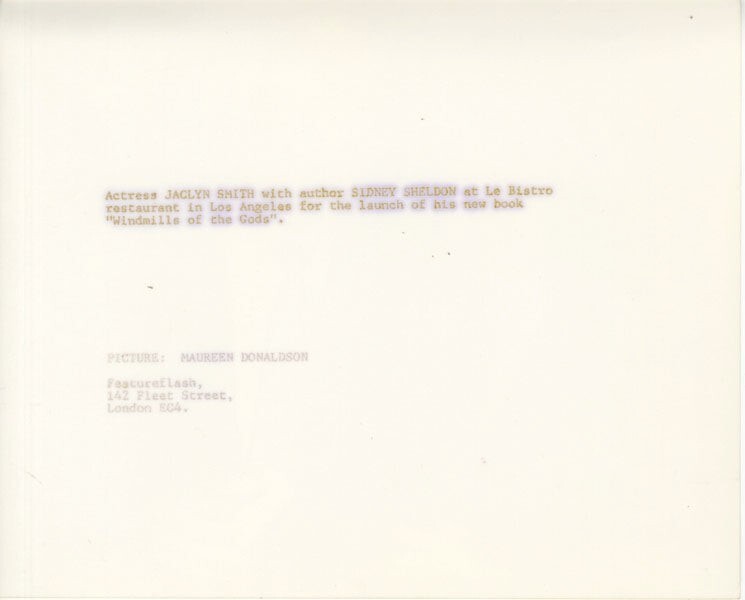 Jaclyn Smith, Sidney Sheldon 1980's Publicity Windmills of the Gods Original 8x10 Photo Stamped with Snipe Near Mint Condition This item is an ORIGINAL 8x10 photo from the historic archives of Silver Screen Mementos. This original photograph was made in the actual year the film, television show or event was produced. The movie studios produced publicity photographs for distribution to the press, photo agencies and publicity departments to advertise the film/tv show or event. Very often original photos have press release information on the reverse of the photo - movie credits, description of the scene, event and people involved. This is a historic piece of cinema art and is being offered from one collector to another, no rights given or implied. Silver Screen are gradually releasing thousands of Original Photographs, Transparencies, Negatives, Lobby Cards, Posters, Magazines and other memorabilia from our historic archive.