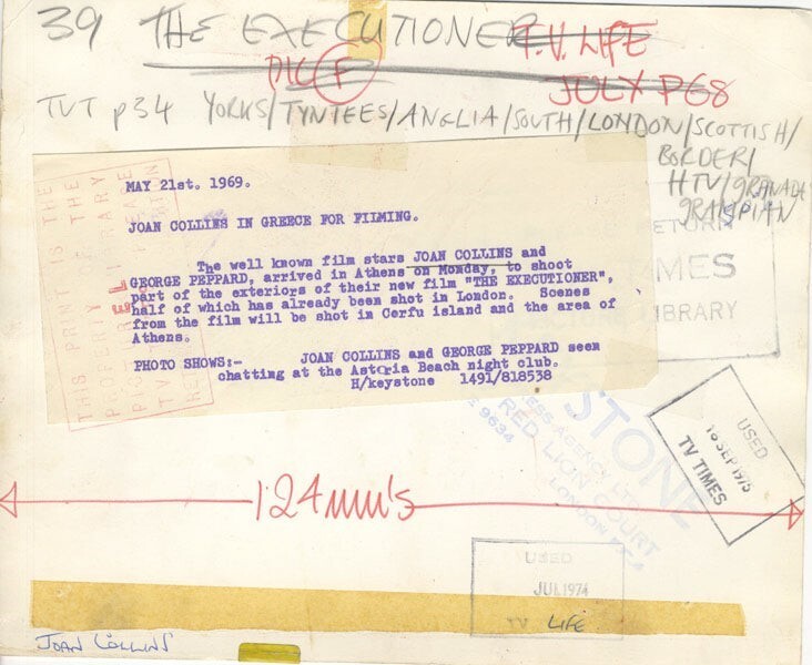 Joan Collins, George Peppard Publicity at Astoria Beach Night Club Athens Greece Publicity for film The Executioner Original 8x10 Double Weight Silver Gelatin Photo Stamped with Snipe 1969 Good Condition (wear to edges and corners, tape at bottom margin, surface marks) This item is an ORIGINAL 8x10 photo from the historic archives of Silver Screen Mementos. This original photograph was made in the actual year the film, television show or event was produced. The movie studios produced publicity photographs for distribution to the press, photo agencies and publicity departments to advertise the film/tv show or event. Very often original photos have press release information on the reverse of the photo - movie credits, description of the scene, event and people involved. This is a historic piece of cinema art and is being offered from one collector to another, no rights given or implied. Silver Screen are gradually releasing thousands of Original Photographs, Transparencies, Negatives, Lobby Cards, Posters, Magazines and other memorabilia from our historic archive.