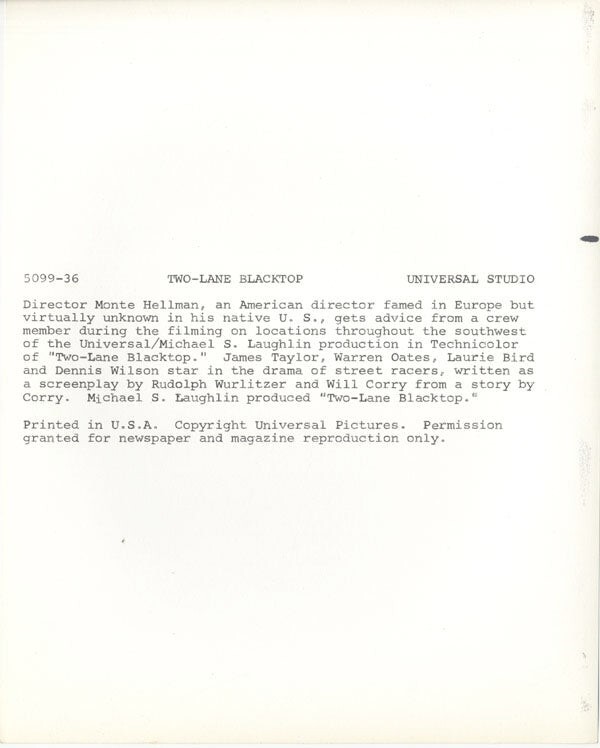 Two Lane Blacktop 1971 Director Monte Hellman Original 8x10 approx Photo with Snipe This item is an ORIGINAL 8x10 photo from the historic archives of Silver Screen Mementos. This original photograph was made in the actual year the film, television show or event was produced. The movie studios produced publicity photographs for distribution to the press, photo agencies and publicity departments to advertise the film/tv show or event. Very often original photos have press release information on the reverse of the photo - movie credits, description of the scene, event and people involved. This is a historic piece of cinema art and is being offered from one collector to another, no rights given or implied. Silver Screen are gradually releasing thousands of Original Photographs, Transparencies, Negatives, Lobby Cards, Posters, Magazines and other memorabilia from our historic archive.