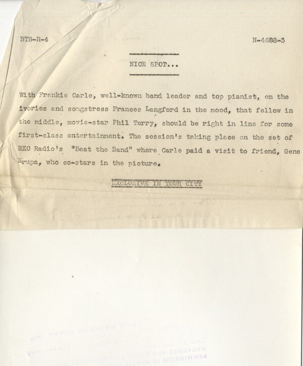 Beat the Band 1947 Frances Langford, Phil Terry, Frankie Carle playing piano Original 7x9 approx Photo Stamped with Snipe VG/Near Mint Condition This item is an ORIGINAL 8x10 photo from the historic archives of Silver Screen Mementos. This original photograph was made in the actual year the film, television show or event was produced. The movie studios produced publicity photographs for distribution to the press, photo agencies and publicity departments to advertise the film/tv show or event. Very often original photos have press release information on the reverse of the photo - movie credits, description of the scene, event and people involved. This is a historic piece of cinema art and is being offered from one collector to another, no rights given or implied. Silver Screen are gradually releasing thousands of Original Photographs, Transparencies, Negatives, Lobby Cards, Posters, Magazines and other memorabilia from our historic archive.