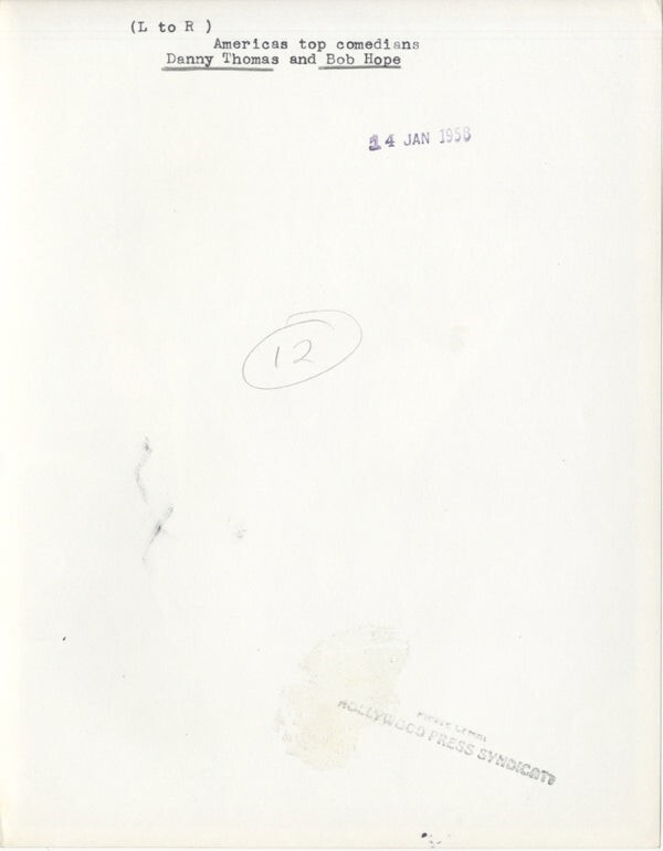 Danny Thomas, Comedian Bob Hope 1950's Portrait Original 7x9 Photo Stamped Near Mint Condition This item is an ORIGINAL 8x10 photo from the historic archives of Silver Screen Mementos. This original photograph was made in the actual year the film, television show or event was produced. The movie studios produced publicity photographs for distribution to the press, photo agencies and publicity departments to advertise the film/tv show or event. Very often original photos have press release information on the reverse of the photo - movie credits, description of the scene, event and people involved. This is a historic piece of cinema art and is being offered from one collector to another, no rights given or implied. Silver Screen are gradually releasing thousands of Original Photographs, Transparencies, Negatives, Lobby Cards, Posters, Magazines and other memorabilia from our historic archive.