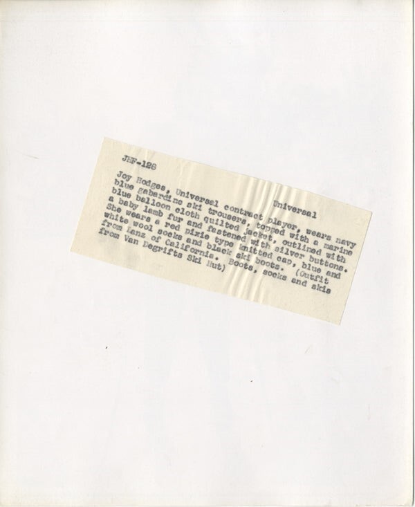 1930's Starlet Joy Hodges modeling Ski Glamour Studio Publicity Portrait clothing designed by Lanz of California Boots & Skies from Van Degrifts Ski Hut Original 8x10 Silver Gelatin Photo with Snipe VG/Near Mint Condition This item is an ORIGINAL 8x10 photo from the historic archives of Silver Screen Mementos. This original photograph was made in the actual year the film, television show or event was produced. The movie studios produced publicity photographs for distribution to the press, photo agencies and publicity departments to advertise the film/tv show or event. Very often original photos have press release information on the reverse of the photo - movie credits, description of the scene, event and people involved. This is a historic piece of cinema art and is being offered from one collector to another, no rights given or implied. Silver Screen are gradually releasing thousands of Original Photographs, Transparencies, Negatives, Lobby Cards, Posters, Magazines and other memorabilia from our historic archive.