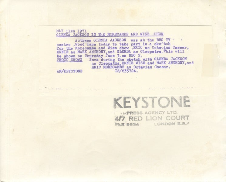 Morecambe & Wise Glenda Jackson, Ernie Wise, Eric Morecambe Cleopatra Skit Original 8x10 Double Weight Silver Gelatin Photo Stamped with Snipe 1971 VG Condition This item is an ORIGINAL 8x10 photo from the historic archives of Silver Screen Mementos. This original photograph was made in the actual year the film, television show or event was produced. The movie studios produced publicity photographs for distribution to the press, photo agencies and publicity departments to advertise the film/tv show or event. Very often original photos have press release information on the reverse of the photo - movie credits, description of the scene, event and people involved. This is a historic piece of cinema art and is being offered from one collector to another, no rights given or implied. Silver Screen are gradually releasing thousands of Original Photographs, Transparencies, Negatives, Lobby Cards, Posters, Magazines and other memorabilia from our historic archive.