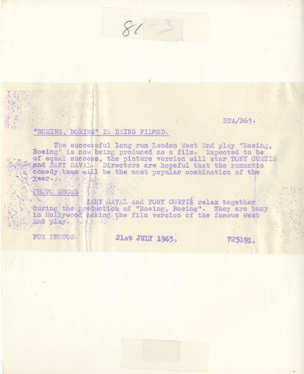 Boeing Boeing Tony Curtis Dany Saval Publicity Original 7x9 approx Photo Snipe 1965 VG Condition This item is an ORIGINAL 8x10 photo from the historic archives of Silver Screen Mementos. This original photograph was made in the actual year the film, television show or event was produced. The movie studios produced publicity photographs for distribution to the press, photo agencies and publicity departments to advertise the film/tv show or event. Very often original photos have press release information on the reverse of the photo - movie credits, description of the scene, event and people involved. This is a historic piece of cinema art and is being offered from one collector to another, no rights given or implied. Silver Screen are gradually releasing thousands of Original Photographs, Transparencies, Negatives, Lobby Cards, Posters, Magazines and other memorabilia from our historic archive.