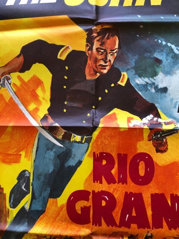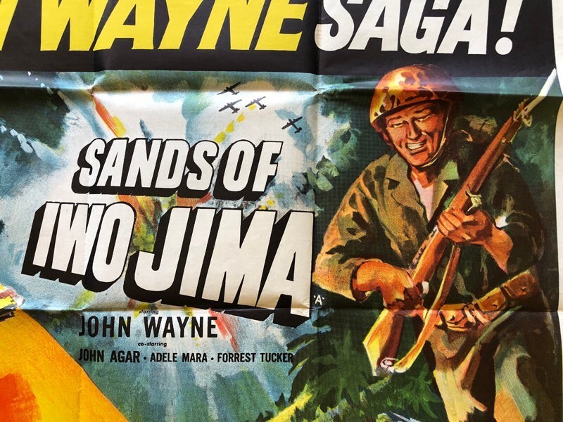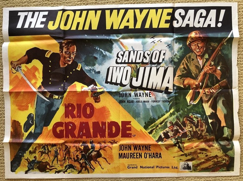 John Wayne Sands of Iwo Jima Rio Grande Original 30x40 British Quad Movie Poster - A wonderful and vibrant color original British Quad Movie poster measuring 30x40 inches from a double bill feature release of two of his most classic movie John Ford's cavalry western 'Rio Grande' and his Academy award nominated performance from 'Sands of Iwo Jima'. This is a stunning poster with great artwork capturing 'The Duke' in action from these two films taht were released on a double feature in the UK , possibly early 1950's. This is a very rare poster being offered in VG/Near Mint Condition (no pin holes, no tears, no tape, minor edge wear) This is the genuine Original Movie Poster released the year of the film, which were machine folded before distribution. This is a real collectors item being released from our historic archive. Silver Screen Mementos are gradually releasing from their vast archives thousands of original photographs, transparencies, negatives, slides, lobby cards , original movie posters, books, magazines and other movie or television memorabilia.