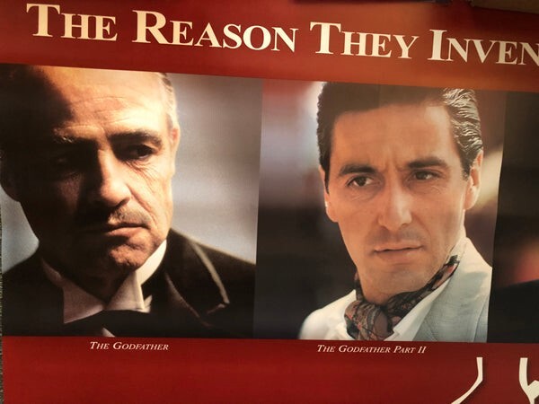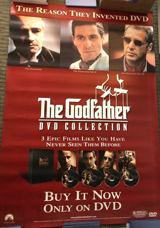 The Godfather Trilogy Original 48x70 Movie Poster Marlon Brando Al Pacino - This is an extremely rare original double sided Bus Stop/Shelter poster measuring approx 48x70 inches for the DVD release of the classic Francis Ford Coppola 'The Godfather' trilogy starring Marlon Brando, Al Pacino, James Caan and Robert De Niro. This is an absolutely stunning and HUGE original dvd movie poster that would be ideal for framing and displaying in home movie theatre, man cave, office or your home. These original bus stop/shelter posters were produced in small numbers and even fewer were kept after use, so they rarely come onto the market. They were displayed in glass bus stop shelter boxes or inside the movie theatres. They are made from heavy stock durable vinyl type material. This unique collectors item will be shipped in heavy duty pipe tube to ensure safe delivery. This exceptional and rare original poster is in VG Condition (minor edge wear) We are gradually releasing from our historic archives original photographs, negatives, transparency, slides, movie posters, magazines, books, press books, pins, autographs, trading cards, press badges and other rare collectors items.