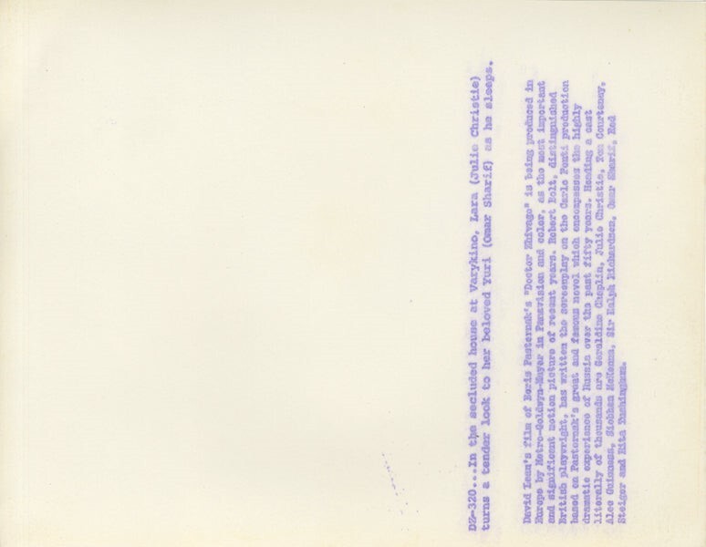 Dr Zhivago 1965 Omar Sharif, Julie Christie at Varykino Original 8x10 Photo with Snipe Near Mint Condition This item is an ORIGINAL 8x10 photo from the historic archives of Silver Screen Mementos. This original photograph was made in the actual year the film, television show or event was produced. The movie studios produced publicity photographs for distribution to the press, photo agencies and publicity departments to advertise the film/tv show or event. Very often original photos have press release information on the reverse of the photo - movie credits, description of the scene, event and people involved. This is a historic piece of cinema art and is being offered from one collector to another, no rights given or implied. Silver Screen are gradually releasing thousands of Original Photographs, Transparencies, Negatives, Lobby Cards, Posters, Magazines and other memorabilia from our historic archive.