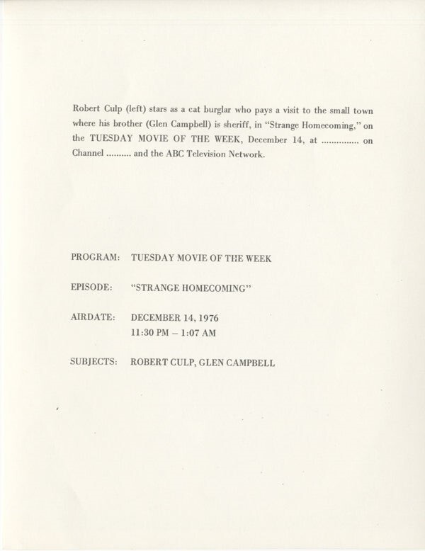 Strange Homecoming Glen Campbell, Robert Culp Original 7x9 Photo with ABC Snipe 1976 Near Mint Condition This item is an ORIGINAL 8x10 photo from the historic archives of Silver Screen Mementos. This original photograph was made in the actual year the film, television show or event was produced. The movie studios produced publicity photographs for distribution to the press, photo agencies and publicity departments to advertise the film/tv show or event. Very often original photos have press release information on the reverse of the photo - movie credits, description of the scene, event and people involved. This is a historic piece of cinema art and is being offered from one collector to another, no rights given or implied. Silver Screen are gradually releasing thousands of Original Photographs, Transparencies, Negatives, Lobby Cards, Posters, Magazines and other memorabilia from our historic archive.