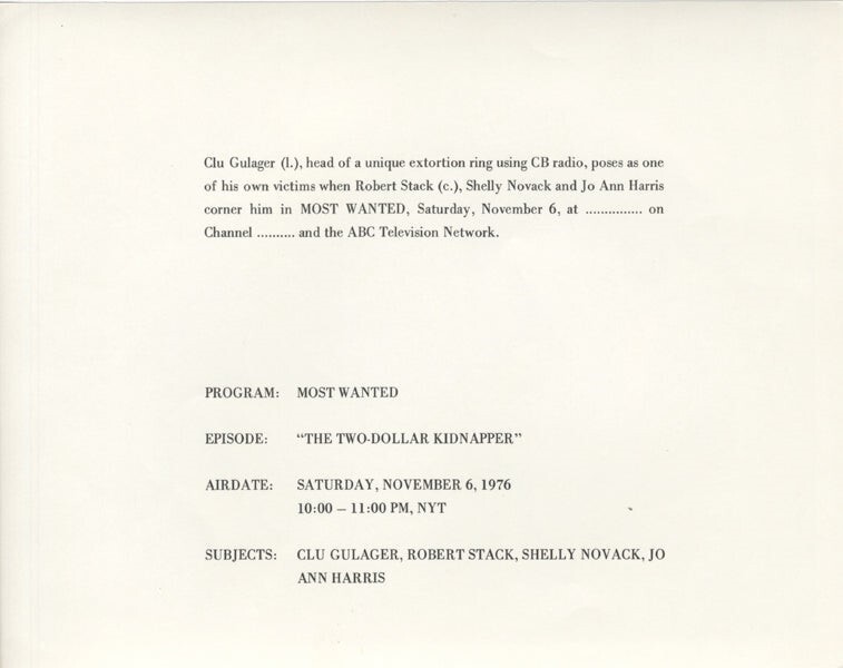 Most Wanted Clu Gulager, Robert Stack, Shelly Novack, Jo Ann Harris ABC Publicity The Two Dollar Kidnapper Episode Original 7x9 Photo with Snipe 1976 Near Mint Condition This item is an ORIGINAL 8x10 photo from the historic archives of Silver Screen Mementos. This original photograph was made in the actual year the film, television show or event was produced. The movie studios produced publicity photographs for distribution to the press, photo agencies and publicity departments to advertise the film/tv show or event. Very often original photos have press release information on the reverse of the photo - movie credits, description of the scene, event and people involved. This is a historic piece of cinema art and is being offered from one collector to another, no rights given or implied. Silver Screen are gradually releasing thousands of Original Photographs, Transparencies, Negatives, Lobby Cards, Posters, Magazines and other memorabilia from our historic archive.