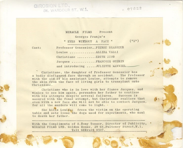 Eyes Without a Face 1960 Horror Juliette Mayniel Screaming Look of Terror Original 8x10 Photo Stamped with Snipe Good/VG Condition This item is an ORIGINAL 8x10 photo from the historic archives of Silver Screen Mementos. This original photograph was made in the actual year the film, television show or event was produced. The movie studios produced publicity photographs for distribution to the press, photo agencies and publicity departments to advertise the film/tv show or event. Very often original photos have press release information on the reverse of the photo - movie credits, description of the scene, event and people involved. This is a historic piece of cinema art and is being offered from one collector to another, no rights given or implied. Silver Screen are gradually releasing thousands of Original Photographs, Transparencies, Negatives, Lobby Cards, Posters, Magazines and other memorabilia from our historic archive.