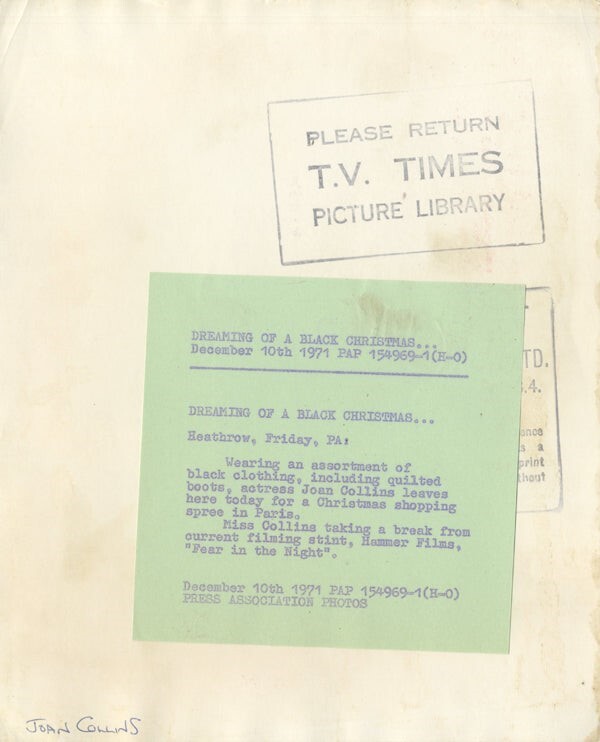 Joan Collins Candid 1971 Heathrow Airport Glamour BEA Airlines jet Original 8x10 Photo Stamped with Snipe Good/VG Condition (wear to edges, creases in corners) This item is an ORIGINAL 8x10 photo from the historic archives of Silver Screen Mementos. This original photograph was made in the actual year the film, television show or event was produced. The movie studios produced publicity photographs for distribution to the press, photo agencies and publicity departments to advertise the film/tv show or event. Very often original photos have press release information on the reverse of the photo - movie credits, description of the scene, event and people involved. This is a historic piece of cinema art and is being offered from one collector to another, no rights given or implied. Silver Screen are gradually releasing thousands of Original Photographs, Transparencies, Negatives, Lobby Cards, Posters, Magazines and other memorabilia from our historic archive.