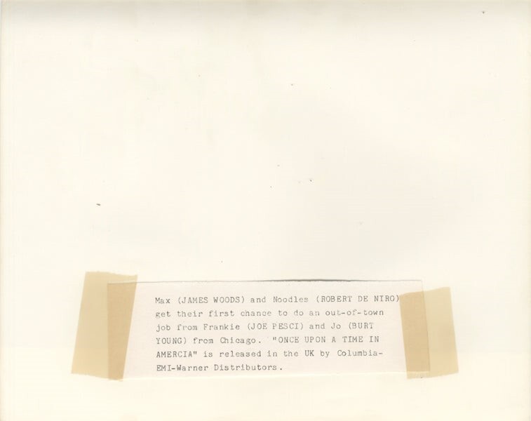 Once Upon a Time in America 1984 James Woods, Robert De Niro, Joe Pesci, Burt Young Original 8x10 Photo with Snipe Near Mint Condition This item is an ORIGINAL 8x10 photo from the historic archives of Silver Screen Mementos. This original photograph was made in the actual year the film, television show or event was produced. The movie studios produced publicity photographs for distribution to the press, photo agencies and publicity departments to advertise the film/tv show or event. Very often original photos have press release information on the reverse of the photo - movie credits, description of the scene, event and people involved. This is a historic piece of cinema art and is being offered from one collector to another, no rights given or implied. Silver Screen are gradually releasing thousands of Original Photographs, Transparencies, Negatives, Lobby Cards, Posters, Magazines and other memorabilia from our historic archive.