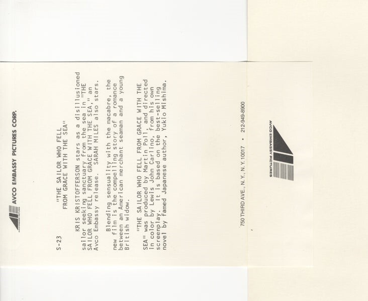 The Sailor Who Fell From Grace with the Sea 1976 Kris Kristofferson Original 8x10 Double Weight Silver Gelatin Photo with Snipe Near Mint Condition This item is an ORIGINAL 8x10 photo from the historic archives of Silver Screen Mementos. This original photograph was made in the actual year the film, television show or event was produced. The movie studios produced publicity photographs for distribution to the press, photo agencies and publicity departments to advertise the film/tv show or event. Very often original photos have press release information on the reverse of the photo - movie credits, description of the scene, event and people involved. This is a historic piece of cinema art and is being offered from one collector to another, no rights given or implied. Silver Screen are gradually releasing thousands of Original Photographs, Transparencies, Negatives, Lobby Cards, Posters, Magazines and other memorabilia from our historic archive.