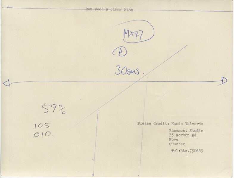 Ronnie Wood of The Rolling Stones Jimmy Page of Led Zeppelin Original Double Weight Silver Gelatin 6x8 approx Photo Stamped , This is a wonderful and very rare image capturing the two legendary guitarists jamming at Jimmy's local pub The Half Moon in Plumpton at a charity gig. Jimmy is playing a Gibson SG guitar, truly iconic and very rare original double weight stamped photograph being offered in VG/Near Mint Condition This item is an ORIGINAL 8x10 photo from the historic archives of Silver Screen Mementos. This original photograph was made in the actual year the film, television show or event was produced. The movie studios produced publicity photographs for distribution to the press, photo agencies and publicity departments to advertise the film/tv show or event. Very often original photos have press release information on the reverse of the photo - movie credits, description of the scene, event and people involved. This is a historic piece of cinema art and is being offered from one collector to another, no rights given or implied. Silver Screen are gradually releasing thousands of Original Photographs, Transparencies, Negatives, Lobby Cards, Posters, Magazines and other memorabilia from our historic archive.