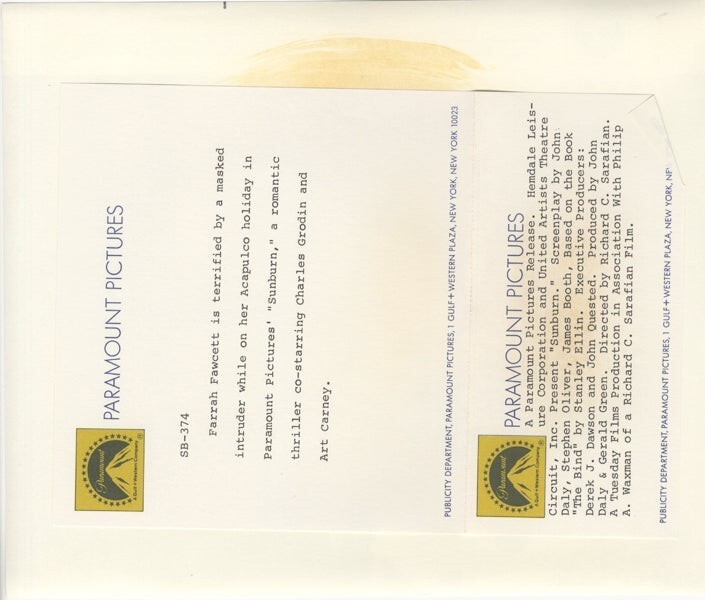 Farrah Fawcett Sunburn 1979 intruder in disguise Original 8x10 Photo with Snipe Near Mint Condition This item is an ORIGINAL 8x10 photo from the historic archives of Silver Screen Mementos. This original photograph was made in the actual year the film, television show or event was produced. The movie studios produced publicity photographs for distribution to the press, photo agencies and publicity departments to advertise the film/tv show or event. Very often original photos have press release information on the reverse of the photo - movie credits, description of the scene, event and people involved. This is a historic piece of cinema art and is being offered from one collector to another, no rights given or implied. Silver Screen are gradually releasing thousands of Original Photographs, Transparencies, Negatives, Lobby Cards, Posters, Magazines and other memorabilia from our historic archive.