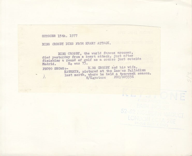 Bing Crosby with wife Kathryn 1970's London Palladium Original 8x10 Photo with Snipe VG Condition This item is an ORIGINAL 8x10 photo from the historic archives of Silver Screen Mementos. This original photograph was made in the actual year the film, television show or event was produced. The movie studios produced publicity photographs for distribution to the press, photo agencies and publicity departments to advertise the film/tv show or event. Very often original photos have press release information on the reverse of the photo - movie credits, description of the scene, event and people involved. This is a historic piece of cinema art and is being offered from one collector to another, no rights given or implied. Silver Screen are gradually releasing thousands of Original Photographs, Transparencies, Negatives, Lobby Cards, Posters, Magazines and other memorabilia from our historic archive.