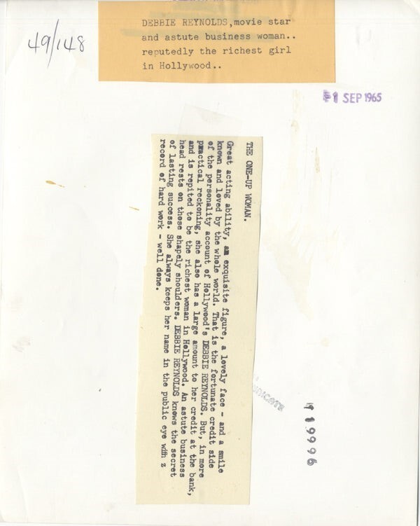 Debbie Reynolds 1965 Publicity Portrait Original 7x9 Photo Stamped with Snipe Good Condition (border trim, surface marks top margin, wear to edges) This item is an ORIGINAL 8x10 photo from the historic archives of Silver Screen Mementos. This original photograph was made in the actual year the film, television show or event was produced. The movie studios produced publicity photographs for distribution to the press, photo agencies and publicity departments to advertise the film/tv show or event. Very often original photos have press release information on the reverse of the photo - movie credits, description of the scene, event and people involved. This is a historic piece of cinema art and is being offered from one collector to another, no rights given or implied. Silver Screen are gradually releasing thousands of Original Photographs, Transparencies, Negatives, Lobby Cards, Posters, Magazines and other memorabilia from our historic archive.