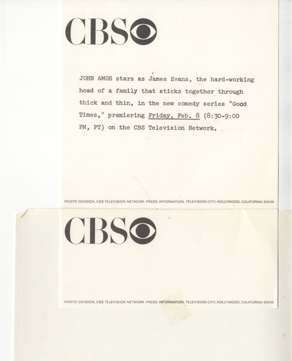 John Amos Good Times 1974 TV Sitcom Publicity Portrait Original 8x10 Photo with CBS Snipe VG/Near Mint Condition This item is an ORIGINAL 8x10 photo from the historic archives of Silver Screen Mementos. This original photograph was made in the actual year the film, television show or event was produced. The movie studios produced publicity photographs for distribution to the press, photo agencies and publicity departments to advertise the film/tv show or event. Very often original photos have press release information on the reverse of the photo - movie credits, description of the scene, event and people involved. This is a historic piece of cinema art and is being offered from one collector to another, no rights given or implied. Silver Screen are gradually releasing thousands of Original Photographs, Transparencies, Negatives, Lobby Cards, Posters, Magazines and other memorabilia from our historic archive.