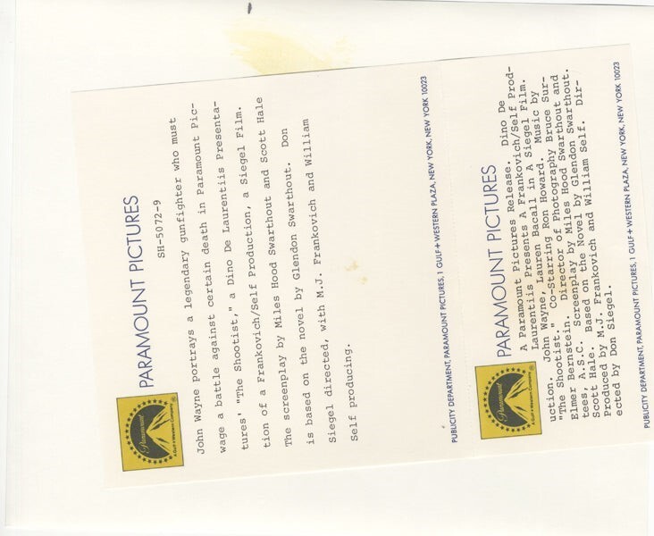 The Shootist 1976 Western John Wayne gun in holster at saloon Original 8x10 Photo with Snipe Near Mint Condition This item is an ORIGINAL 8x10 photo from the historic archives of Silver Screen Mementos. This original photograph was made in the actual year the film, television show or event was produced. The movie studios produced publicity photographs for distribution to the press, photo agencies and publicity departments to advertise the film/tv show or event. Very often original photos have press release information on the reverse of the photo - movie credits, description of the scene, event and people involved. This is a historic piece of cinema art and is being offered from one collector to another, no rights given or implied. Silver Screen are gradually releasing thousands of Original Photographs, Transparencies, Negatives, Lobby Cards, Posters, Magazines and other memorabilia from our historic archive.