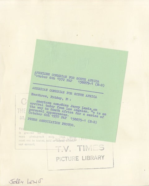 Jerry Lewis South Africa Airport TWA Jet Original 8x10 Photo Stamped Snipe 1972 VG/Near Mint Condition This item is an ORIGINAL 8x10 photo from the historic archives of Silver Screen Mementos. This original photograph was made in the actual year the film, television show or event was produced. The movie studios produced publicity photographs for distribution to the press, photo agencies and publicity departments to advertise the film/tv show or event. Very often original photos have press release information on the reverse of the photo - movie credits, description of the scene, event and people involved. This is a historic piece of cinema art and is being offered from one collector to another, no rights given or implied. Silver Screen are gradually releasing thousands of Original Photographs, Transparencies, Negatives, Lobby Cards, Posters, Magazines and other memorabilia from our historic archive.
