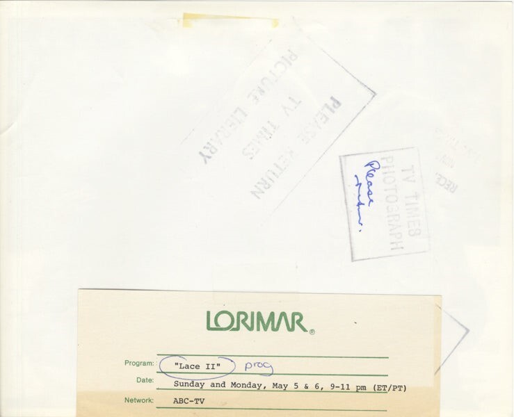 Lace 2 1985 Brooke Adams, Arielle Dombasle, Deborah Raffin Original 8x10 Photo Stamped Near Mint Condition This item is an ORIGINAL 8x10 photo from the historic archives of Silver Screen Mementos. This original photograph was made in the actual year the film, television show or event was produced. The movie studios produced publicity photographs for distribution to the press, photo agencies and publicity departments to advertise the film/tv show or event. Very often original photos have press release information on the reverse of the photo - movie credits, description of the scene, event and people involved. This is a historic piece of cinema art and is being offered from one collector to another, no rights given or implied. Silver Screen are gradually releasing thousands of Original Photographs, Transparencies, Negatives, Lobby Cards, Posters, Magazines and other memorabilia from our historic archive.