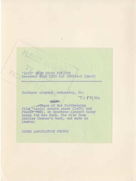 Lace Brooke Adams, Phoebe Cates Heathrow Airport London Original 7x9 Photo Stamped with Snipe 1983 VG/Near Mint Condition This item is an ORIGINAL 8x10 photo from the historic archives of Silver Screen Mementos. This original photograph was made in the actual year the film, television show or event was produced. The movie studios produced publicity photographs for distribution to the press, photo agencies and publicity departments to advertise the film/tv show or event. Very often original photos have press release information on the reverse of the photo - movie credits, description of the scene, event and people involved. This is a historic piece of cinema art and is being offered from one collector to another, no rights given or implied. Silver Screen are gradually releasing thousands of Original Photographs, Transparencies, Negatives, Lobby Cards, Posters, Magazines and other memorabilia from our historic archive.