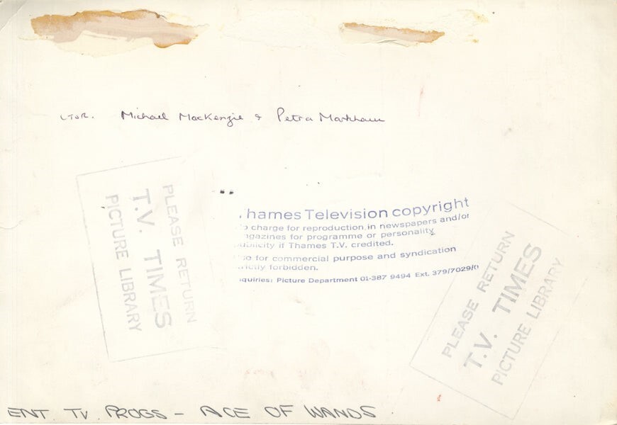 Ace of Wands Michael MacKenzie, Petra Markham Original 8x11 Double Weight Photo Stamped VG Condition This item is an ORIGINAL 8x10 photo from the historic archives of Silver Screen Mementos. This original photograph was made in the actual year the film, television show or event was produced. The movie studios produced publicity photographs for distribution to the press, photo agencies and publicity departments to advertise the film/tv show or event. Very often original photos have press release information on the reverse of the photo - movie credits, description of the scene, event and people involved. This is a historic piece of cinema art and is being offered from one collector to another, no rights given or implied. Silver Screen are gradually releasing thousands of Original Photographs, Transparencies, Negatives, Lobby Cards, Posters, Magazines and other memorabilia from our historic archive.