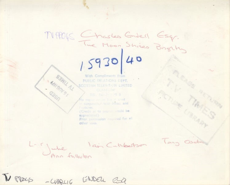 The Moon Shines Bright on Charlie Endell Ian Cuthbertson Tony Osoba Julie Ann Fullarton Original 8x10 Photo Stamped 1979 VG/Near Mint Condition This item is an ORIGINAL 8x10 photo from the historic archives of Silver Screen Mementos. This original photograph was made in the actual year the film, television show or event was produced. The movie studios produced publicity photographs for distribution to the press, photo agencies and publicity departments to advertise the film/tv show or event. Very often original photos have press release information on the reverse of the photo - movie credits, description of the scene, event and people involved. This is a historic piece of cinema art and is being offered from one collector to another, no rights given or implied. Silver Screen are gradually releasing thousands of Original Photographs, Transparencies, Negatives, Lobby Cards, Posters, Magazines and other memorabilia from our historic archive.