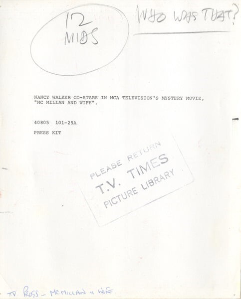 McMillan and Wife 1970's TV Series Nancy Walker Original 8x10 Photo Stamped with Snipe VG/Near Mint Condition This item is an ORIGINAL 8x10 photo from the historic archives of Silver Screen Mementos. This original photograph was made in the actual year the film, television show or event was produced. The movie studios produced publicity photographs for distribution to the press, photo agencies and publicity departments to advertise the film/tv show or event. Very often original photos have press release information on the reverse of the photo - movie credits, description of the scene, event and people involved. This is a historic piece of cinema art and is being offered from one collector to another, no rights given or implied. Silver Screen are gradually releasing thousands of Original Photographs, Transparencies, Negatives, Lobby Cards, Posters, Magazines and other memorabilia from our historic archive.