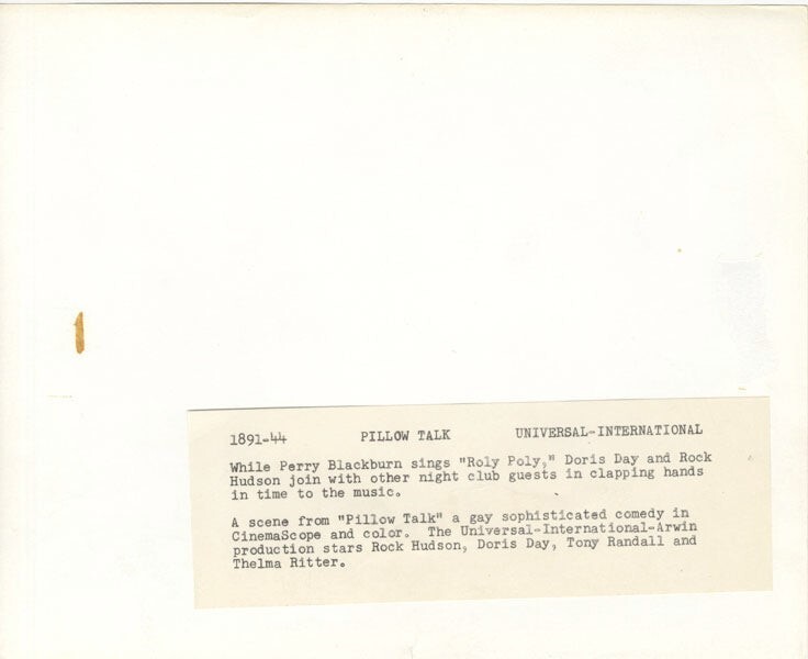 Pillow Talk Doris Day, Rock Hudson, Singer Perry Blackwell nightclub bar scene Original 8x10 Photo with Snipe 1959 VG/Near Mint Condition This item is an ORIGINAL 8x10 photo from the historic archives of Silver Screen Mementos. This original photograph was made in the actual year the film, television show or event was produced. The movie studios produced publicity photographs for distribution to the press, photo agencies and publicity departments to advertise the film/tv show or event. Very often original photos have press release information on the reverse of the photo - movie credits, description of the scene, event and people involved. This is a historic piece of cinema art and is being offered from one collector to another, no rights given or implied. Silver Screen are gradually releasing thousands of Original Photographs, Transparencies, Negatives, Lobby Cards, Posters, Magazines and other memorabilia from our historic archive.