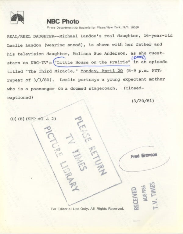 Little House on the Prairie Michael Landon, Leslie Landon, Melissa Sue Anderson Original 7x9 Photo Stamped with Snipe 1981 Near Mint Condition This item is an ORIGINAL 8x10 photo from the historic archives of Silver Screen Mementos. This original photograph was made in the actual year the film, television show or event was produced. The movie studios produced publicity photographs for distribution to the press, photo agencies and publicity departments to advertise the film/tv show or event. Very often original photos have press release information on the reverse of the photo - movie credits, description of the scene, event and people involved. This is a historic piece of cinema art and is being offered from one collector to another, no rights given or implied. Silver Screen are gradually releasing thousands of Original Photographs, Transparencies, Negatives, Lobby Cards, Posters, Magazines and other memorabilia from our historic archive.