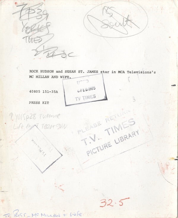 McMillan & Wife Susan Saint James, Rock Hudson Original 8x10 Photo Stamped with Snipe Fair/Good Condition (surface marks, wear to edges) This item is an ORIGINAL 8x10 photo from the historic archives of Silver Screen Mementos. This original photograph was made in the actual year the film, television show or event was produced. The movie studios produced publicity photographs for distribution to the press, photo agencies and publicity departments to advertise the film/tv show or event. Very often original photos have press release information on the reverse of the photo - movie credits, description of the scene, event and people involved. This is a historic piece of cinema art and is being offered from one collector to another, no rights given or implied. Silver Screen are gradually releasing thousands of Original Photographs, Transparencies, Negatives, Lobby Cards, Posters, Magazines and other memorabilia from our historic archive.