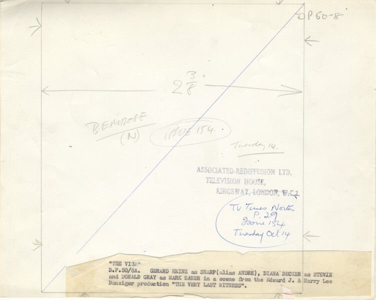 The Vise Gerard Heinz, Diana Decker, Donald Gray, The Very Last Witness 1957 Episode Original 8x10 Photo Stamped with Snipe Good/VG Condition (surface marks, wear to edges) This item is an ORIGINAL 8x10 photo from the historic archives of Silver Screen Mementos. This original photograph was made in the actual year the film, television show or event was produced. The movie studios produced publicity photographs for distribution to the press, photo agencies and publicity departments to advertise the film/tv show or event. Very often original photos have press release information on the reverse of the photo - movie credits, description of the scene, event and people involved. This is a historic piece of cinema art and is being offered from one collector to another, no rights given or implied. Silver Screen are gradually releasing thousands of Original Photographs, Transparencies, Negatives, Lobby Cards, Posters, Magazines and other memorabilia from our historic archive.