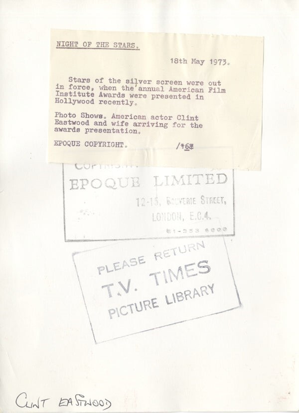 Clint Eastwood & wife Candid AFI Awards Original 7x9 Photo Stamped with Snipe 1973 VG/Near Mint Condition This item is an ORIGINAL 8x10 photo from the historic archives of Silver Screen Mementos. This original photograph was made in the actual year the film, television show or event was produced. The movie studios produced publicity photographs for distribution to the press, photo agencies and publicity departments to advertise the film/tv show or event. Very often original photos have press release information on the reverse of the photo - movie credits, description of the scene, event and people involved. This is a historic piece of cinema art and is being offered from one collector to another, no rights given or implied. Silver Screen are gradually releasing thousands of Original Photographs, Transparencies, Negatives, Lobby Cards, Posters, Magazines and other memorabilia from our historic archive.